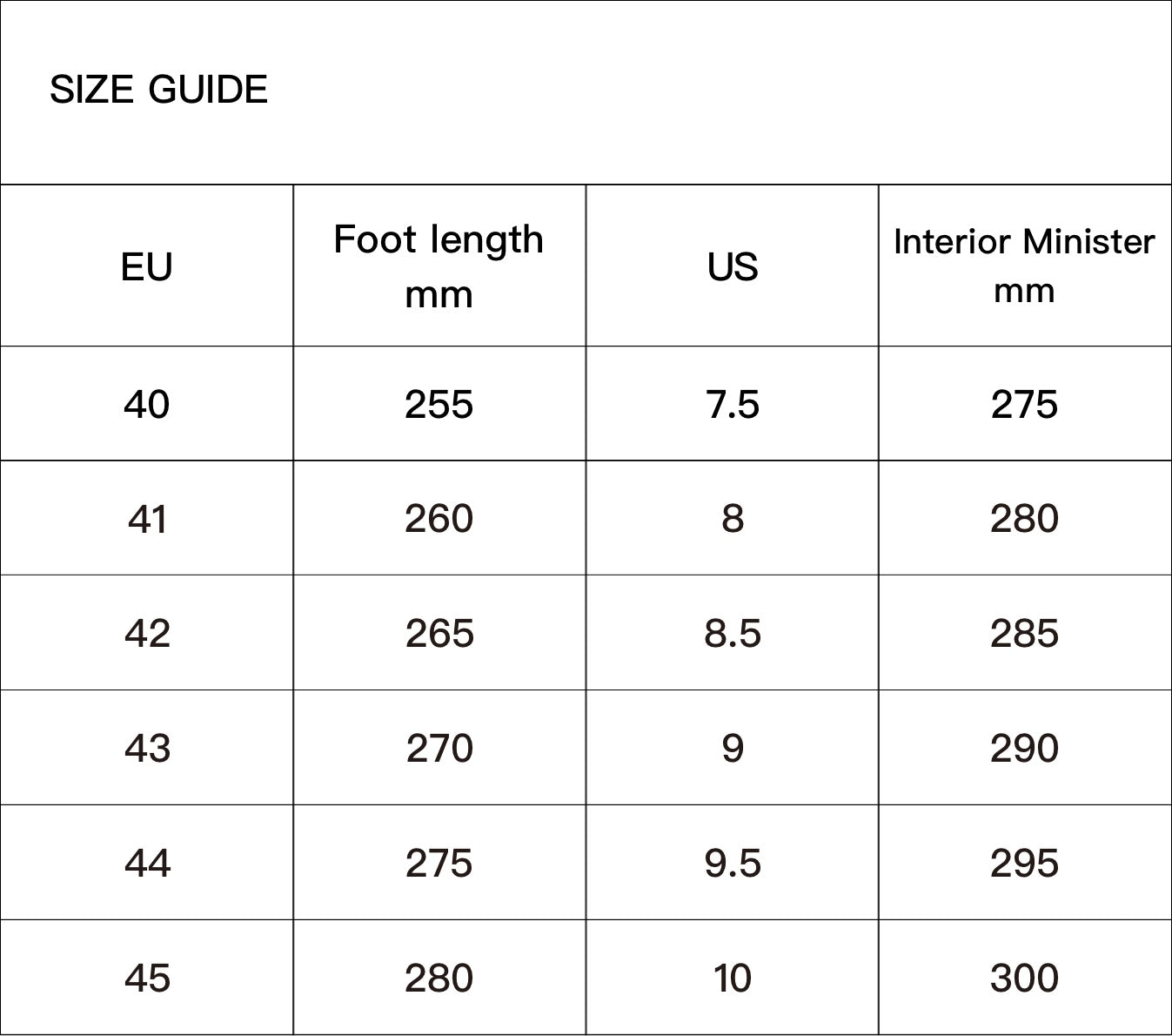 For example: If you wear a size 42 athletic shoe, it is recommended to choose a size 41; if you have wider feet or a higher instep, choose a size 42.
